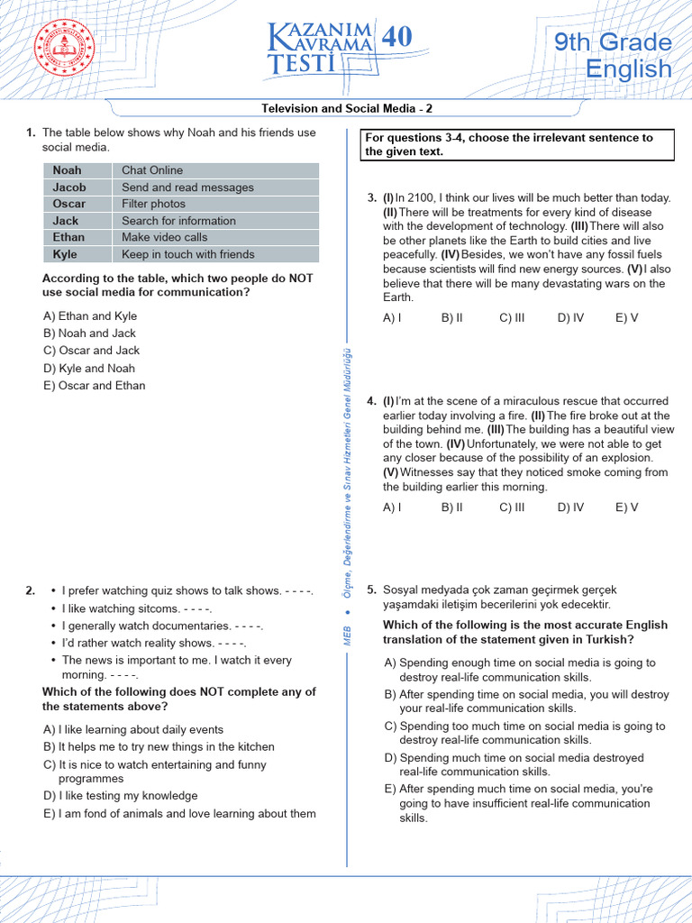 1. The table below shows why Noah and his friends use For questions 3-4, choose the irrelevant sentence to
