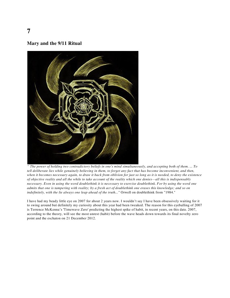 The power of holding two contradictory beliefs in one's mind simultaneously, and accepting both of them. ... To tell deliberate lies while genuinely believing in them, to forget any fact that has become inconvenient, and then, when it becomes necessary again, to draw it back from oblivion for just so long as it is needed, to deny the existence of objective reality and all the while to take account of the reality which one deniesall this is indispensably necessary. Even in using the word doublethink it is necessary to exercise doublethink. For by using the word one admits that one is tampering with reality; by a fresh act of doublethink one erases this knowledge; and so on indefinitely, with the lie always one leap ahead of the truth..." Orwell on doublethink from "1984." I have had my beady little eye on 2007 for about 2 years now. I wouldnt say I have been obsessively waiting for it to swing around but definitely my curiosity about this year had been tweaked. The reason for this eyeballing of 2007 is Terrence McKennas 'Timewave Zero' predicting the highest spike of habit, in recent years, on this date. 2007, according to the theory, will see the most unrest (habit) before the wave heads down towards its final novelty zero point and the eschaton on 21 December 2012.