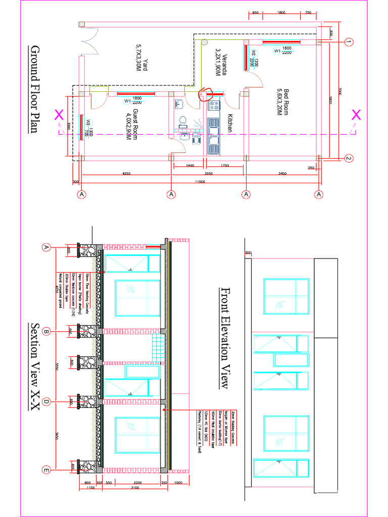 The document contains architectural plans for a building, including dimensions for various rooms such as a bedroom, kitchen, guest room, and veranda. It features a ground floor plan and front elevation view, detailing the layout and measurements of each space. Additionally, there are section views included for further clarity on the design.