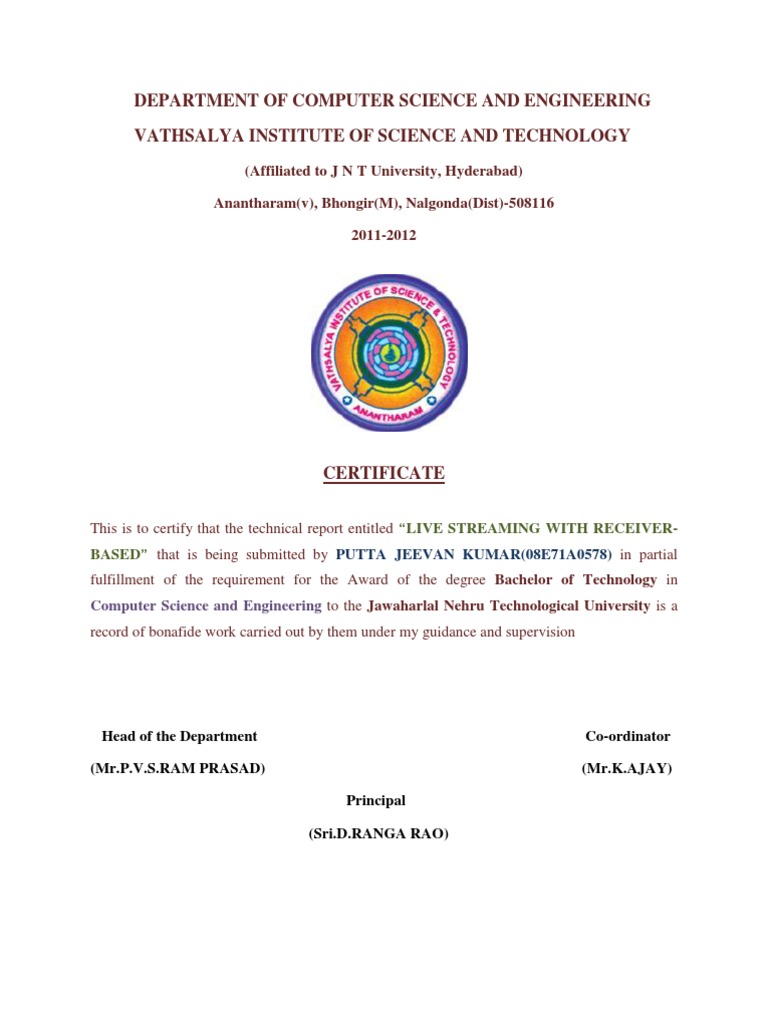 This is to certify that the technical report entitled LIVE STREAMING WITH RECEIVERBASED that is being submitted by PUTTA JEEVAN KUMAR(08E71A0578) in partial fulfillment of the requirement for the Award of the degree Bachelor of Technology in Computer Science and Engineering to the Jawaharlal Nehru Technological University is a record of bonafide work carried out by them under my guidance and supervision