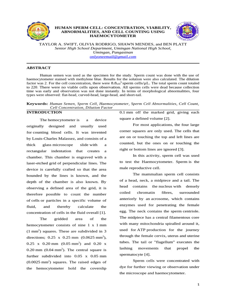 Keywords: Human Semen, Sperm Cell, Haemocytometer, Sperm Cell Abnormalities, Cell Count,