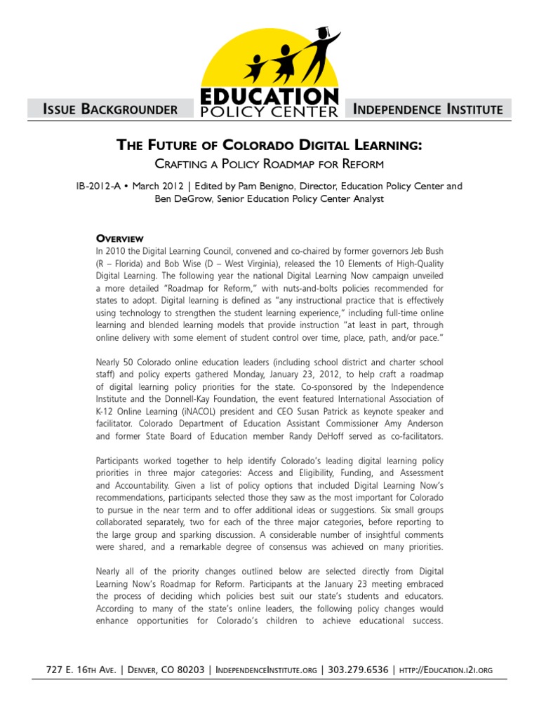 More information on digital learning and supporting policies can be found in the following: Digital Learning Now!, Roadmap for Reform (national), http://digitallearningnow.com/roadmap-to-reform/ Digital Learning Now!, Nations Digital Learning Report Card, http://digitallearningnow.com/nations-report-card/ Donnell-Kay Foundation, Blended Learning: The Best of Both Worlds, http://www.dkfoundation.org/PDF/BlendedLearning-BestOfBothWorlds-Feb2011.pdf Evergreen Education Group, Keeping Pace with K-12 Online Learning, http://kpk12.com/ Independence Institute, Choosing a Colorado Online School for Your Child, http://education.i2i.org/2011/12/choosing-a-colorado-online-school-for-your-child/ Innosight Institute, The Rise of K-12 Blended Learning: Profiles of Emerging Models, http://www.innosightinstitute.org/media-room/publications/blended-learning/ International Association of K-12 Online Learning, Fast Facts about Online Learning, http://www.inacol.org/press/docs/nacol_fast_facts.pdf Thomas B. Fordham Institute, School Finance in the Digital-Learning Era, http://www.edexcellence.net/publications/school-finance-in-the-digital-learning-era.html Thomas B. Fordham Institute, Quality Control in K-12 Digital Learning: Three (Imperfect) Approaches, http://www.edexcellence.net/publications/quality-control-in-k-12-digital-learning.html Copyright 2012, Independence Institute INDEPENDENCE INSTITUTE is a non-profit, non-partisan Colorado think tank. It is governed by a statewide board of trustees and holds a 501(c)(3) tax exemption from the IRS. Its public policy research focuses on economic growth, education reform, local government effectiveness, and constitutional rights. JON CALDARA is President of the Independence Institute. PAMELA BENIGNO is the Director of the Education Policy Center. BENJAMIN DEGROW is Senior Education Policy Analyst. SPECIAL THANKS for their critical roles in helping to develop the Policy Roadmap go to: Susan Patrick, President and CEO, International Association of K-12 Online Learning; from the Colorado Department of Education, Amy Berk Anderson, Assistant Commissioner of Innovation and Choice, and Amanda Heiney, Senior Consultant, Unit of Online Learning; Randy DeHoff, Director of Strategic Growth, GOAL Academy; and from the Donnell-Kay Foundation, Matt Samelson, Director of Special Projects, and Kristina Tabor, Director of Communications. ADDITIONAL RESOURCES on this subject can be found at: http://education.i2i.org/. NOTHING WRITTEN here is to be construed as necessarily representing the views of the Independence Institute or as an attempt to influence any election or legislative action. PERMISSION TO REPRINT this document in whole or in part is hereby granted provided full credit is given to the Independence Institute.