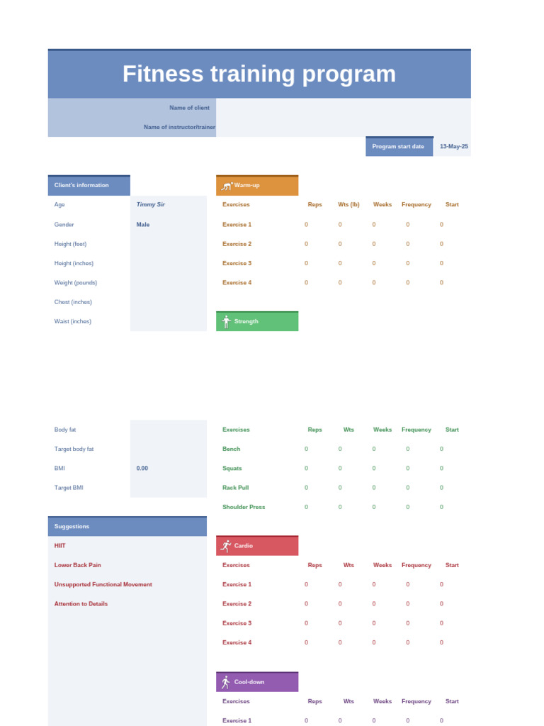 Age Timmy Sir Exercises Reps Wts (lb) Weeks Frequency Start