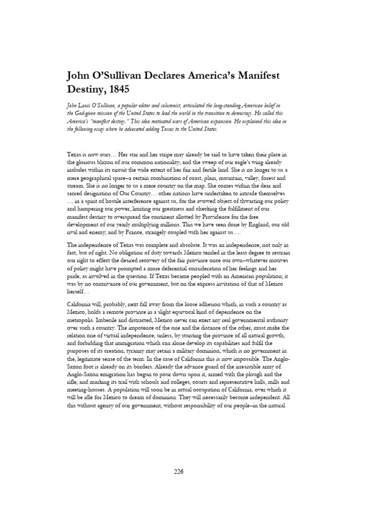 America’s “manifest destiny.” This idea motivated wars of American expansion. He explained this idea in