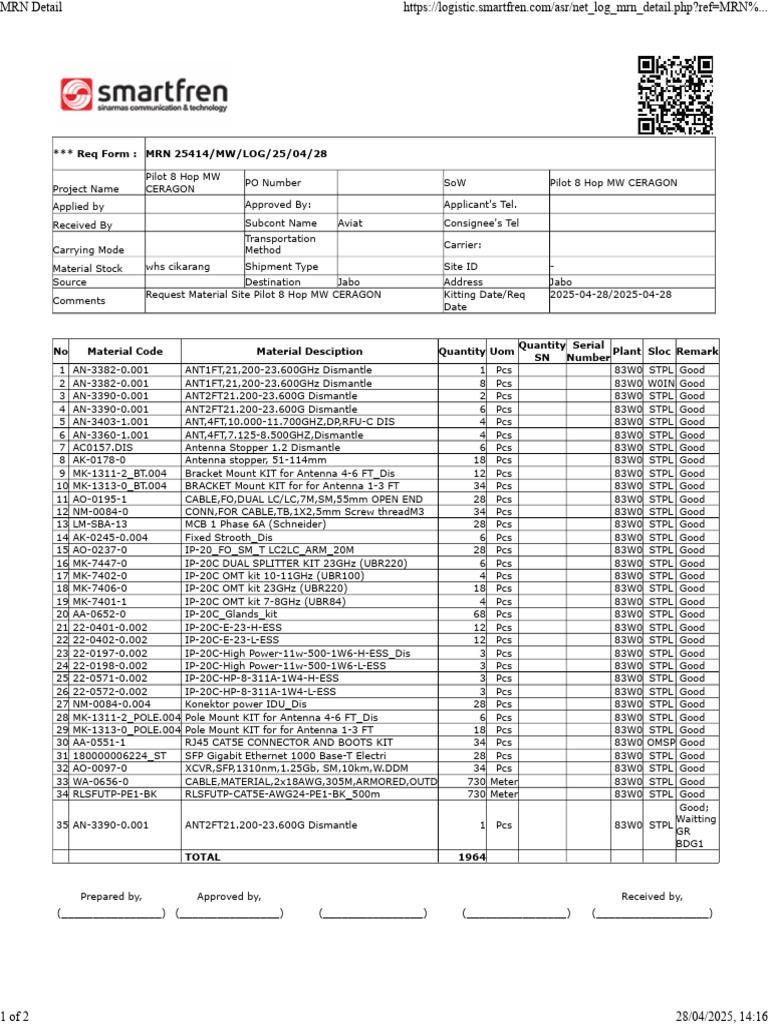 Request Material Site Pilot 8 Hop MW CERAGON Kitting Date/Req 2025-04-28/2025-04-28
