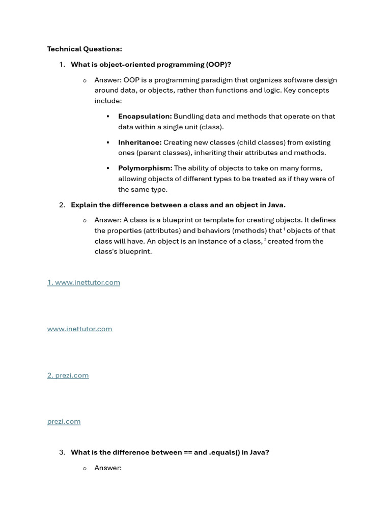 o Answer: A class is a blueprint or template for creating objects. It defines