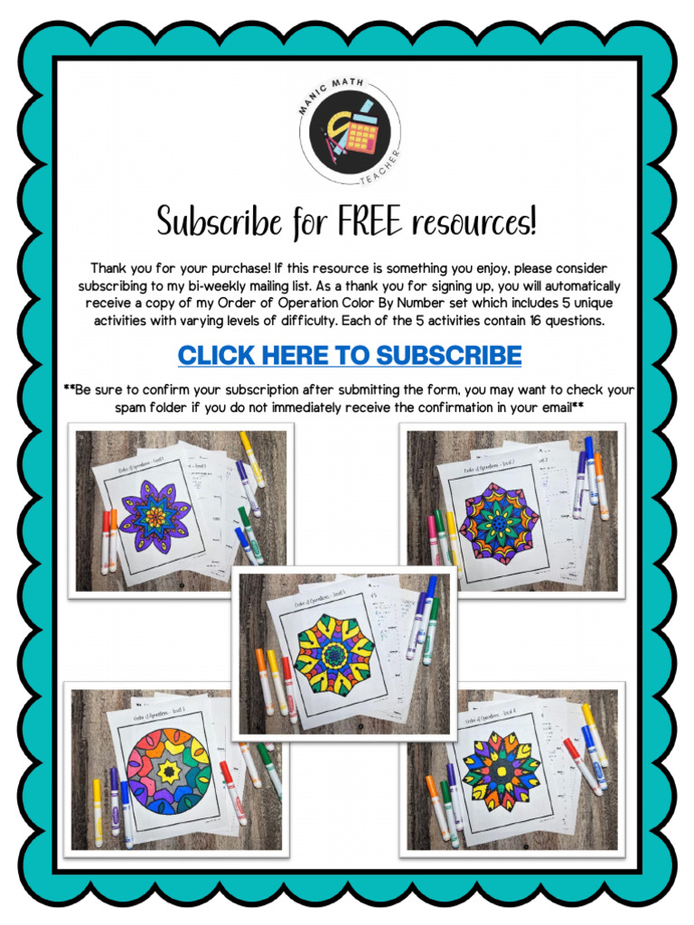 receive a copy of my Order of Operation Color By Number set which includes 5 unique