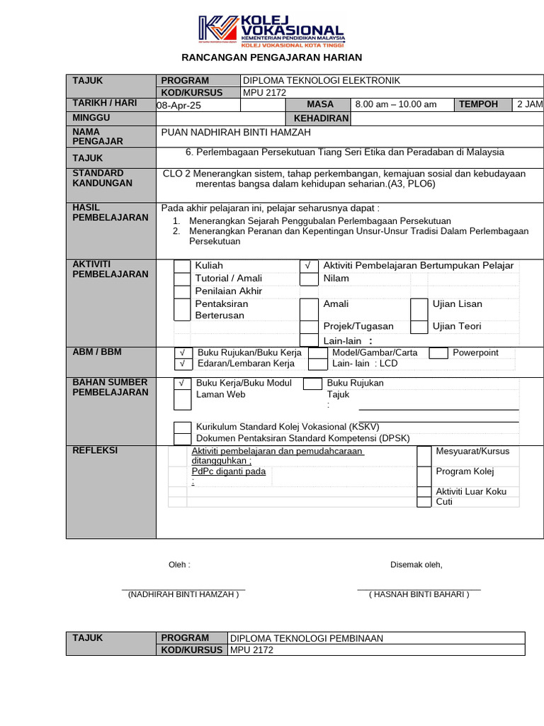 TARIKH / HARI 08-Apr-25 Selasa MASA 8.00 am – 10.00 am TEMPOH 2 JAM