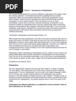 1. Globalization: The process of increased interconnectedness and interdependence among countries,