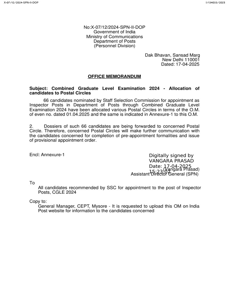 Allocation of Postal Circles to successful candidates under CGLE 2024 for the post of Inspector Posts