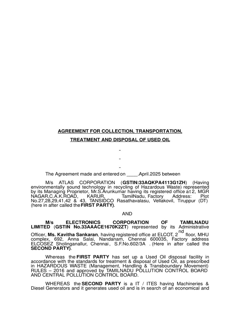 Whereas the FIRST PARTY has set up a Used Oil disposal facility in