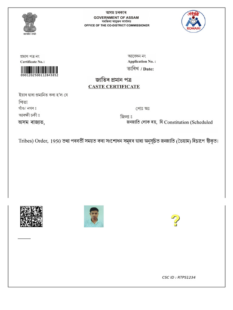 This is to certify that PAWAN SAIKIA Son/Daughter of GIRIDHAR SAIKIA Vill/Town DANGDHORA