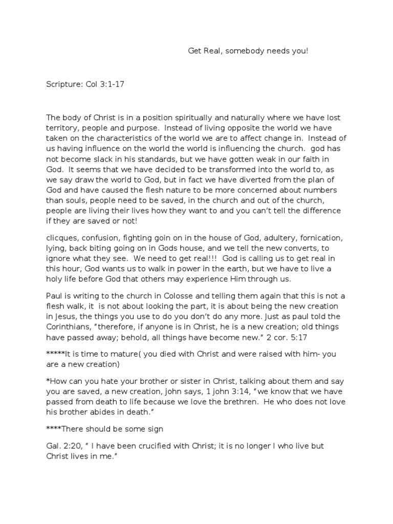 The body of Christ is in a position spiritually and naturally where we have lost territory, people and purpose. Instead of living opposite the world we have taken on the characteristics of the world we are to affect change in. Instead of us having influence on the world the world is influencing the church. god has not become slack in his standards, but we have gotten weak in our faith in God. It seems that we have decided to be transformed into the world to, as we say draw the world to God, but in fact we have diverted from the plan of God and have caused the flesh nature to be more concerned about numbers than souls, people need to be saved, in the church and out of the church, people are living their lives how they want to and you cant tell the difference if they are saved or not! clicques, confusion, fighting goin on in the house of God, adultery, fornication, lying, back biting going on in Gods house, and we tell the new converts, to ignore what they see. We need to get real!!! God is calling us to get real in this hour, God wants us to walk in power in the earth, but we have to live a holy life before God that others may experience Him through us. Paul is writing to the church in Colosse and telling them again that this is not a flesh walk, it is not about looking the part, it is about being the new creation in Jesus, the things you use to do you dont do any more. Just as paul told the Corinthians, therefore, if anyone is in Christ, he is a new creation; old things have passed away; behold, all things have become new. 2 cor. 5:17 *****It is time to mature( you died with Christ and were raised with him- you are a new creation) *How can you hate your brother or sister in Christ, talking about them and say you are saved, a new creation, john says, 1 john 3:14, we know that we have passed from death to life because we love the brethren. He who does not love his brother abides in death. ****There should be some sign Gal. 2:20, I have been crucified with Christ; it is no longer I who live but Christ lives in me.