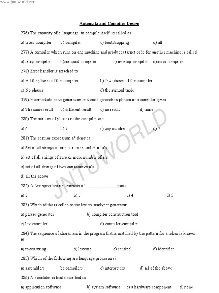 Automata and Compiler Design 276) The capacity of a language to compile itself is called as a) cross-compiler b) compiler c) bootstrapping d) all