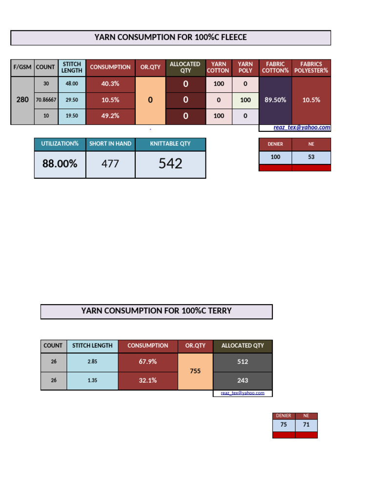 YARN CONSUMPTION FOR 100%C TERRY