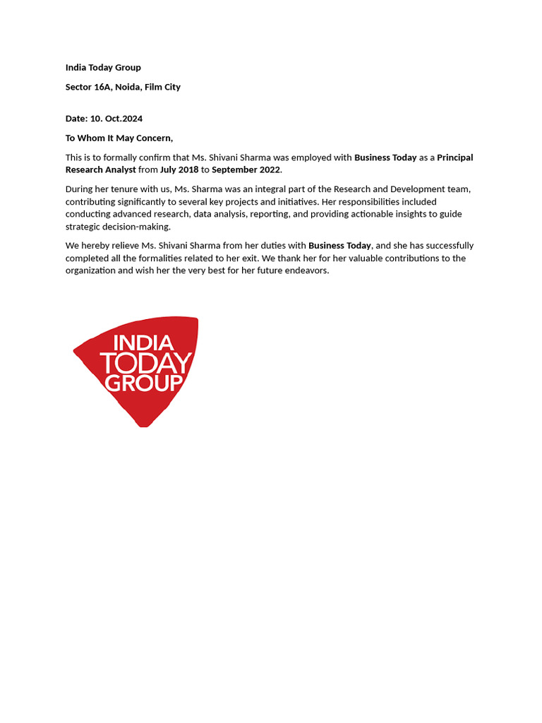 This is to formally confirm that Ms. Shivani Sharma was employed with Business Today as a Principal