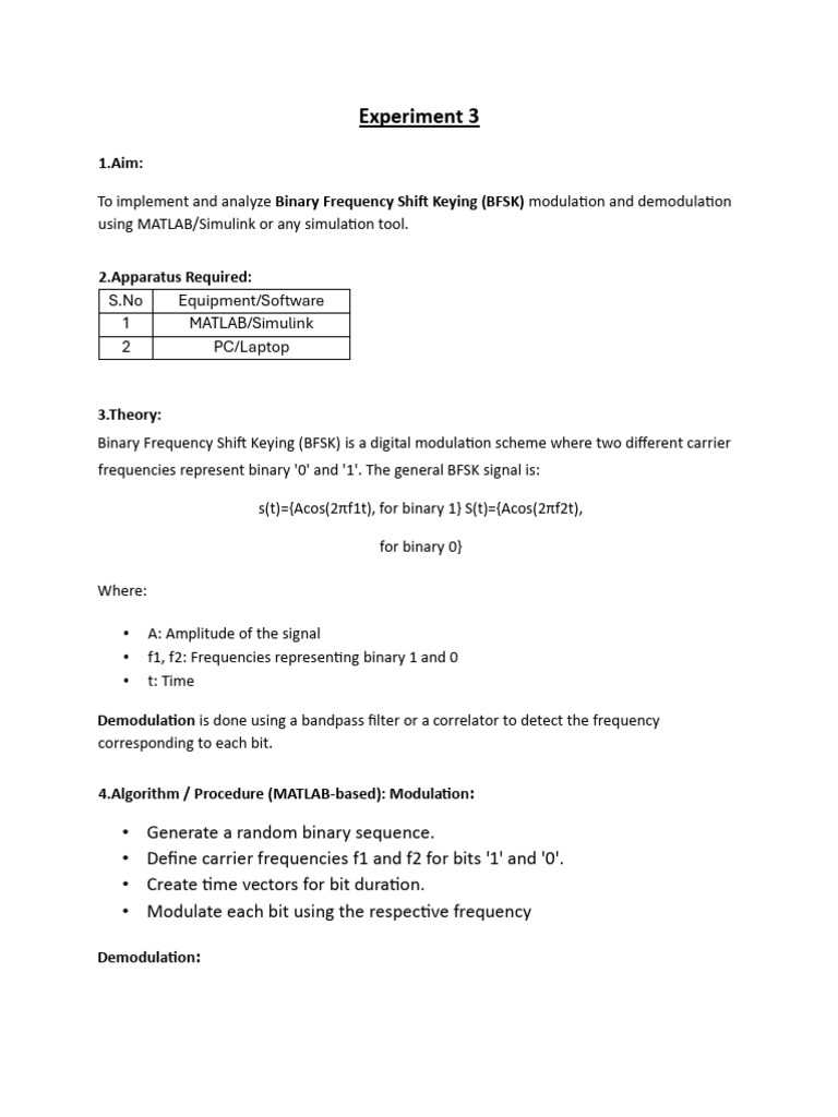 To implement and analyze Binary Frequency Shift Keying (BFSK) modulation and demodulation