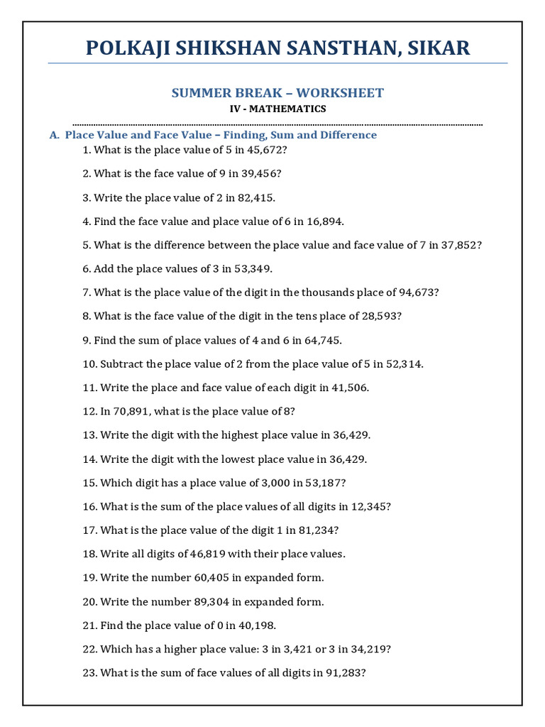A. Place Value and Face Value – Finding, Sum and Difference