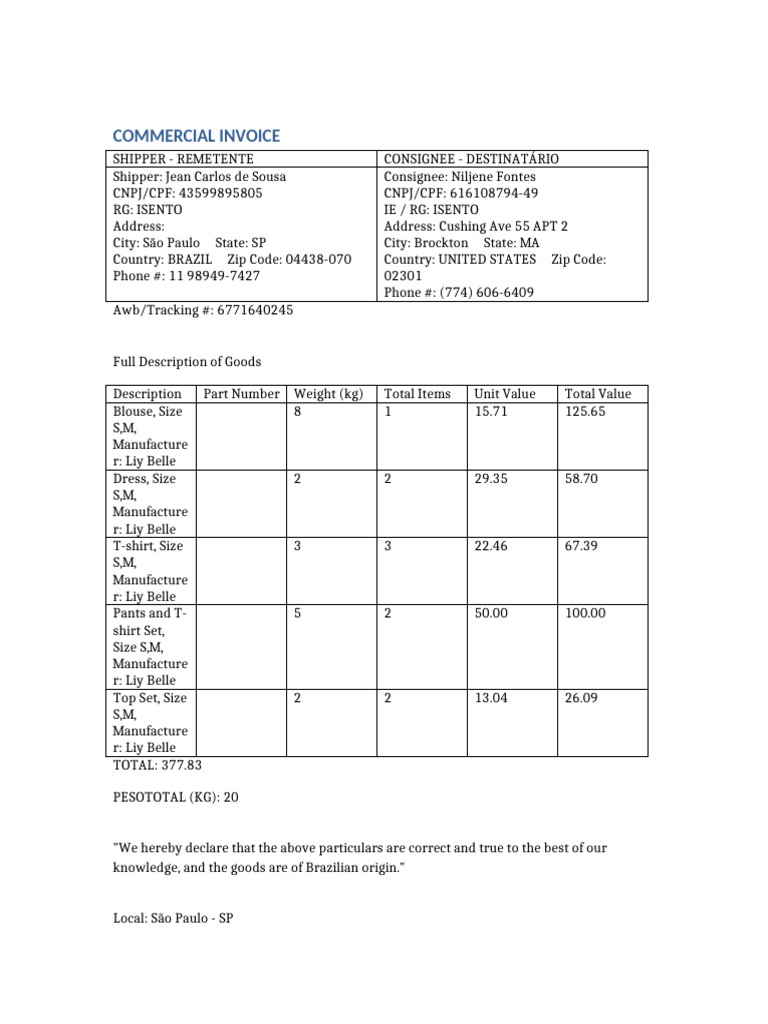 Shipper: Jean Carlos de Sousa Consignee: Niljene Fontes