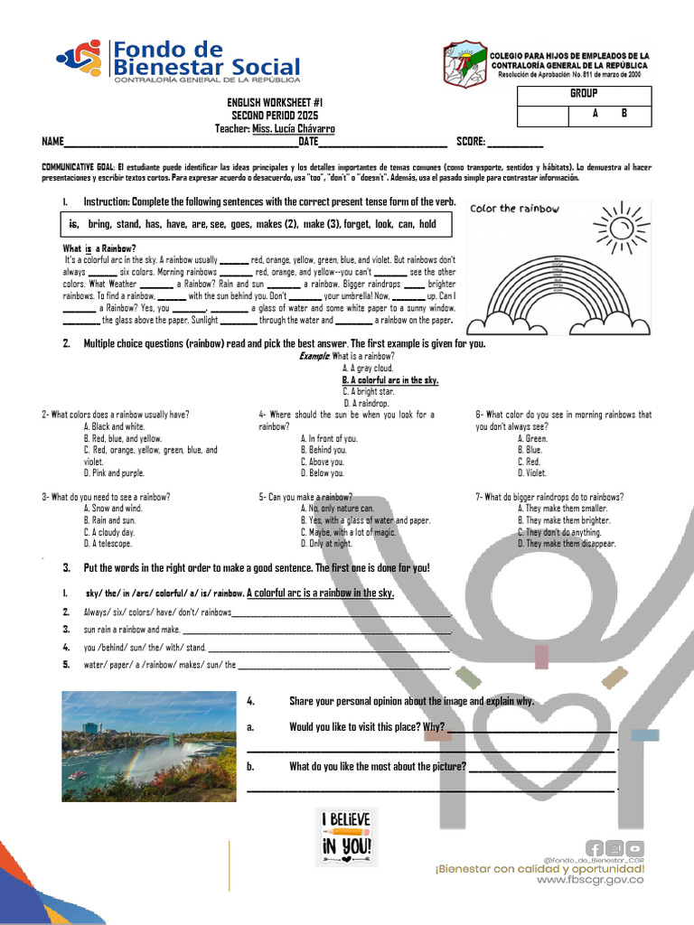 It’s a colorful arc in the sky. A rainbow usually _______ red, orange, yellow, green, blue, and violet. But rainbows don’t
