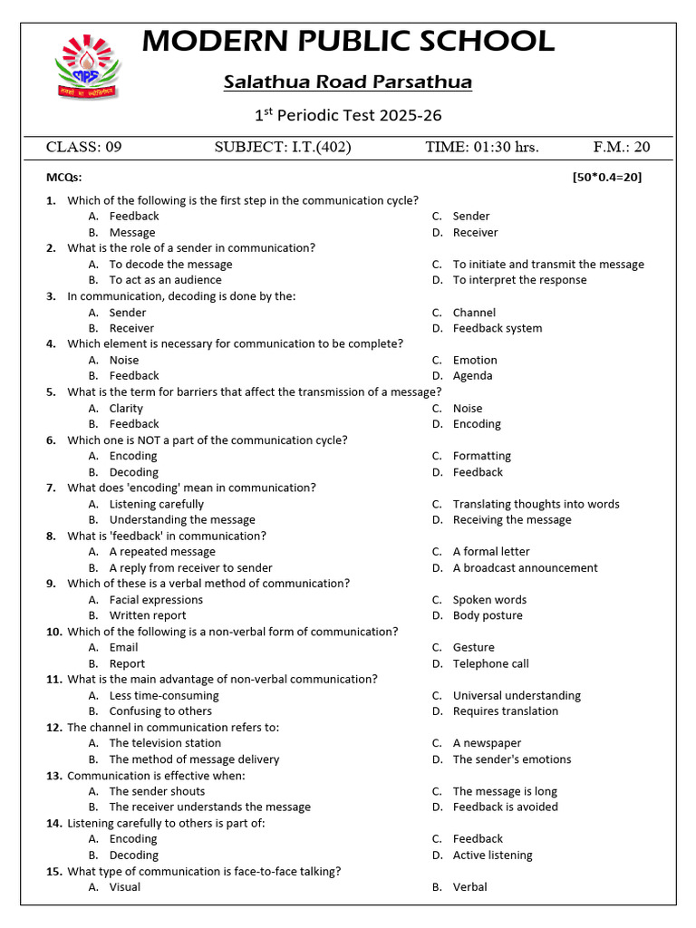 CLASS: 09 SUBJECT: I.T.(402) TIME: 01:30 hrs. F.M.: 20