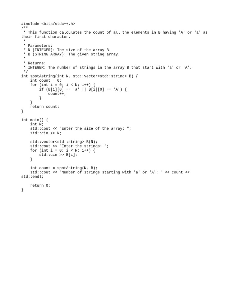std::cout << "Number of strings starting with 'a' or 'A': " << count <<