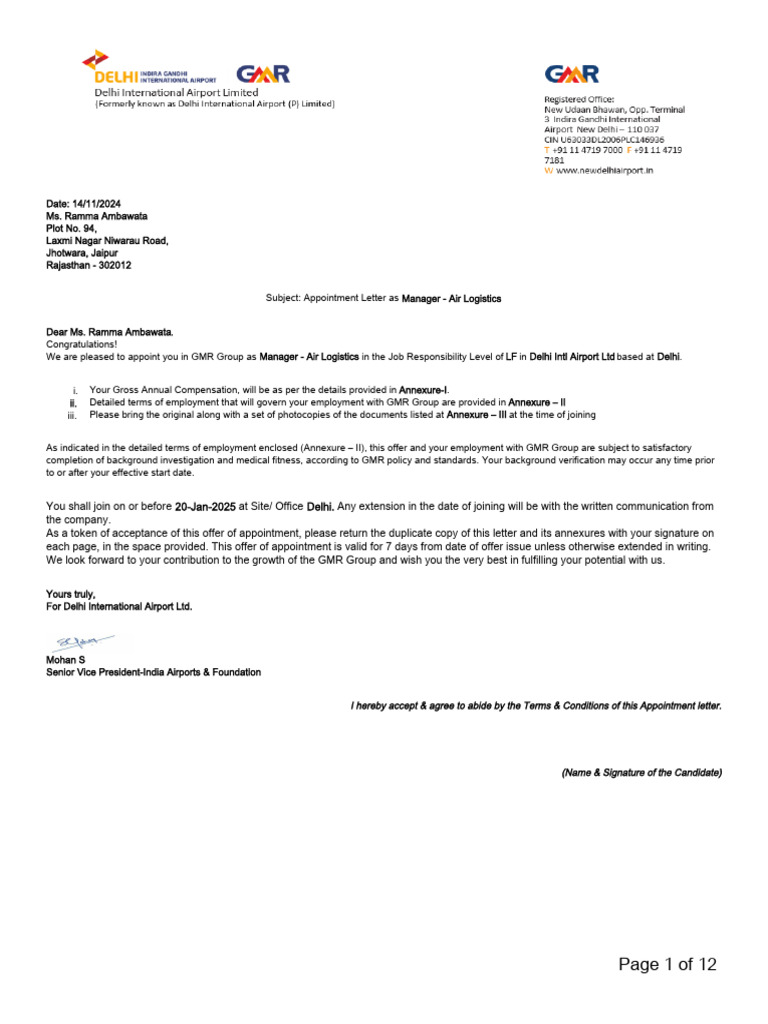 As indicated in the detailed terms of employment enclosed (Annexure – II), this offer and your employment with GMR Group are subject to satisfactory