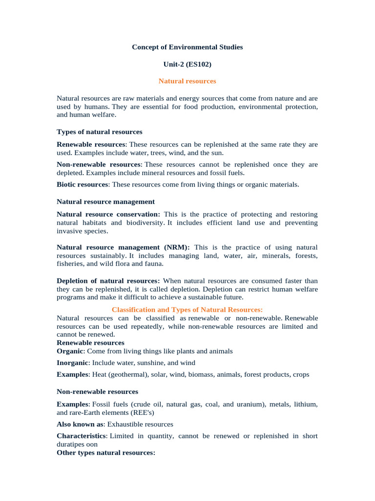 Natural resources can be classified as renewable or non-renewable. Renewable