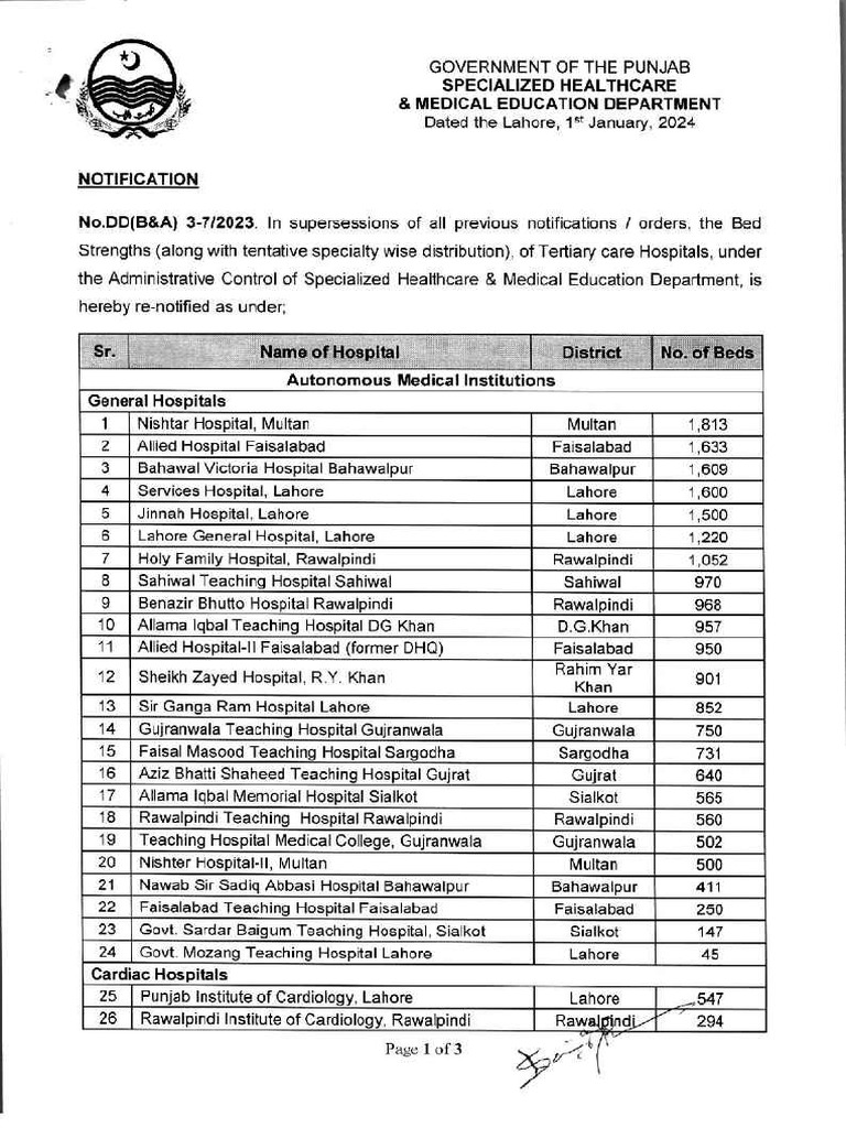 The Government of Punjab has re-notified the bed strengths and specialty-wise distribution for tertiary care hospitals under the Specialized Healthcare & Medical Education Department. The total bed capacity across various hospitals is 34,067, with detailed listings for autonomous and non-autonomous medical institutions. This notification supersedes all previous orders and aims to standardize hospital capacities across the province.
