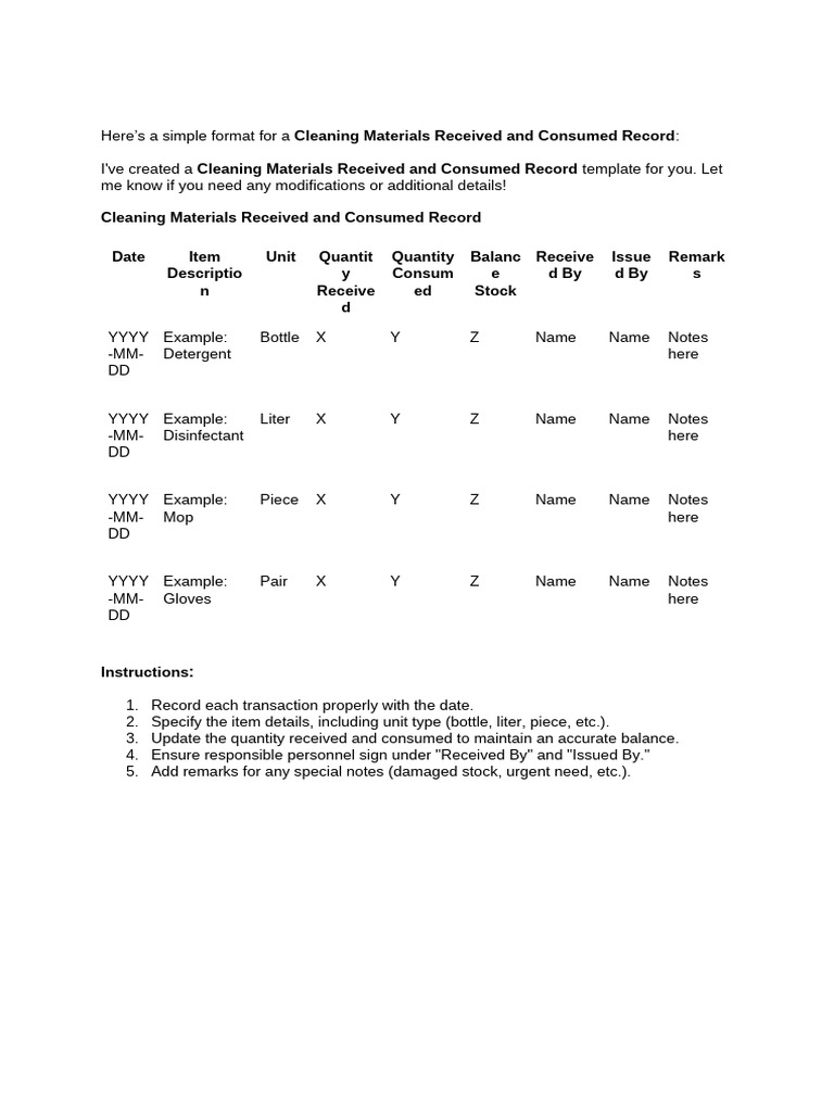 Here’s a simple format for a Cleaning Materials Received and Consumed Record: