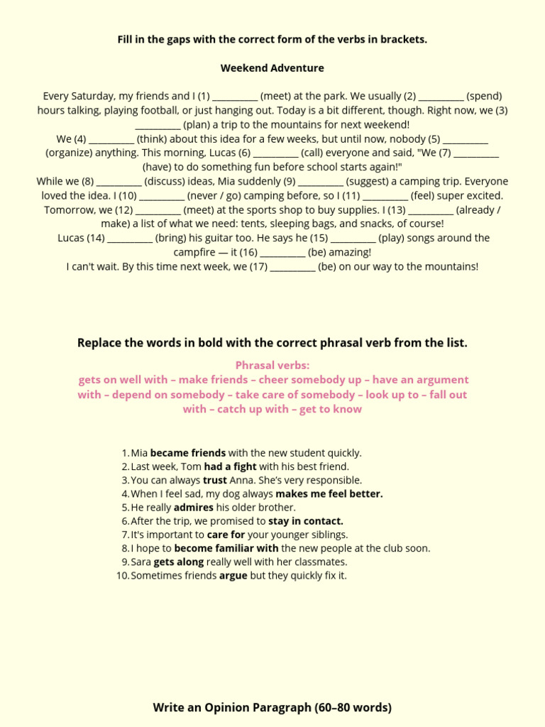 Every Saturday, my friends and I (1) __________ (meet) at the park. We usually (2) __________ (spend)