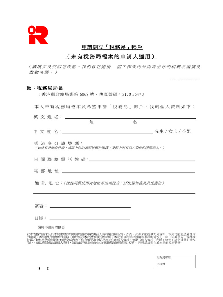 本人未有稅務局檔案及希望申請「稅務易」帳戶。我的個人資料如下:
