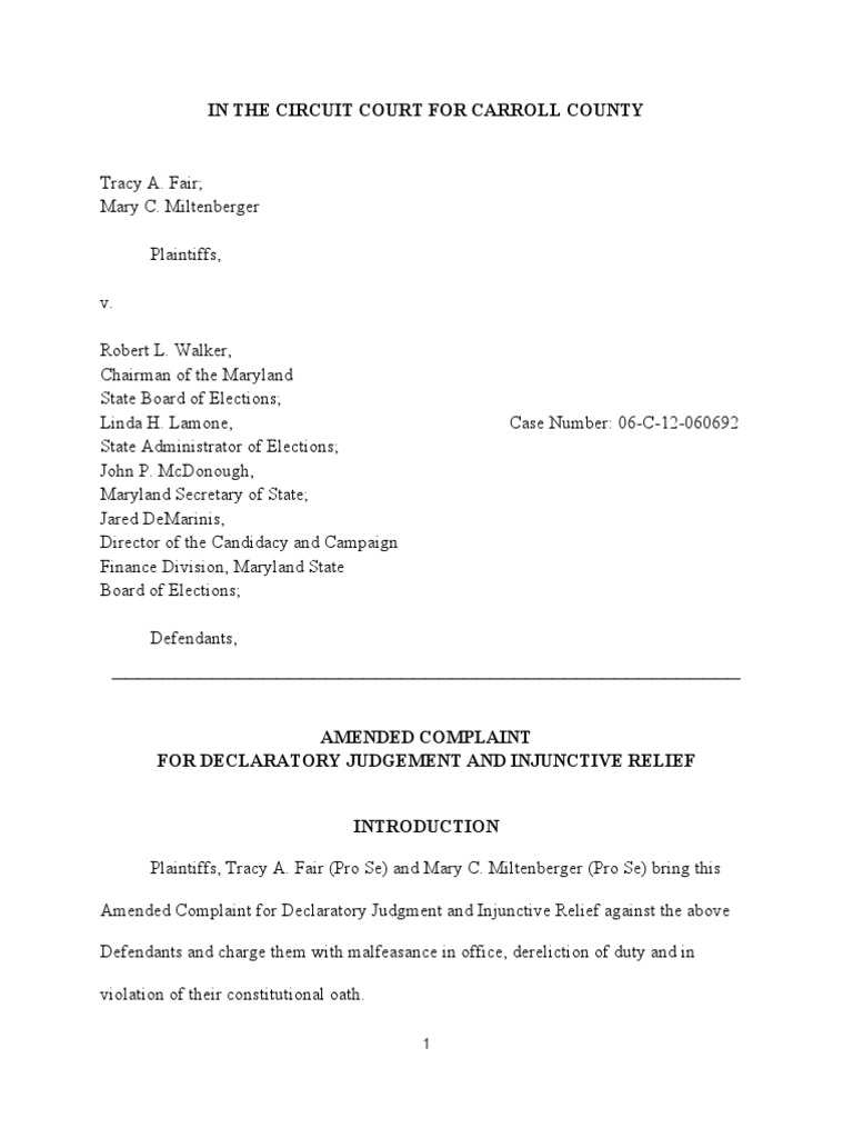 Tracy A. Fair;Mary C. Miltenberger Plaintiffs, v. Robert L. Walker,Chairman of the MarylandState Board of Elections;Linda H. Lamone, Case Number: 06-C-12-060692State Administrator of Elections;John P. McDonough,Maryland Secretary of State;Jared DeMarinis,Director of the Candidacy and CampaignFinance Division, Maryland StateBoard of Elections; Defendants,