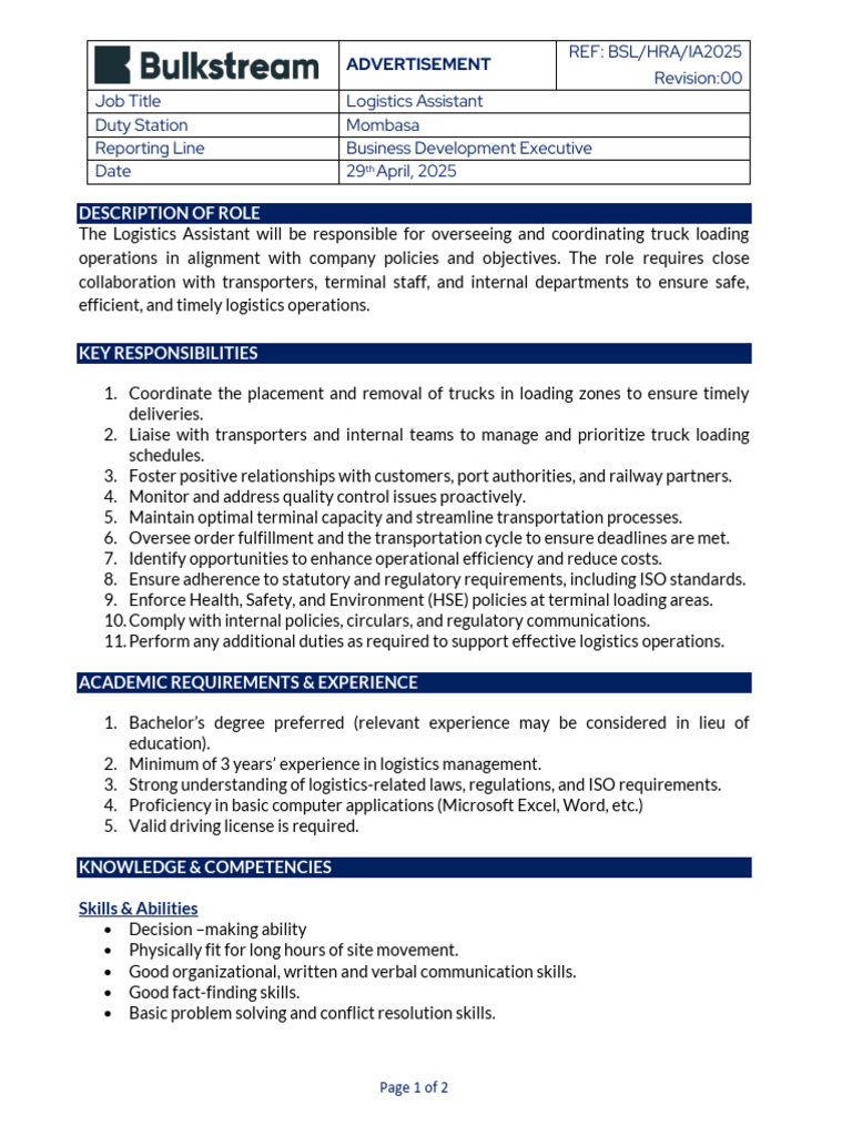 The Logistics Assistant will be responsible for overseeing and coordinating truck loading