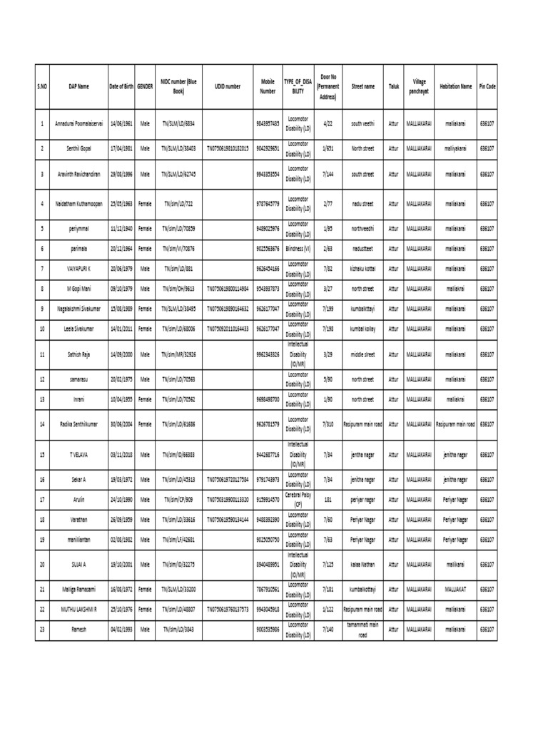 S.NO DAP Name Date of Birth GENDER UDID number (Permanent Street name Taluk Habitation Name Pin Code
