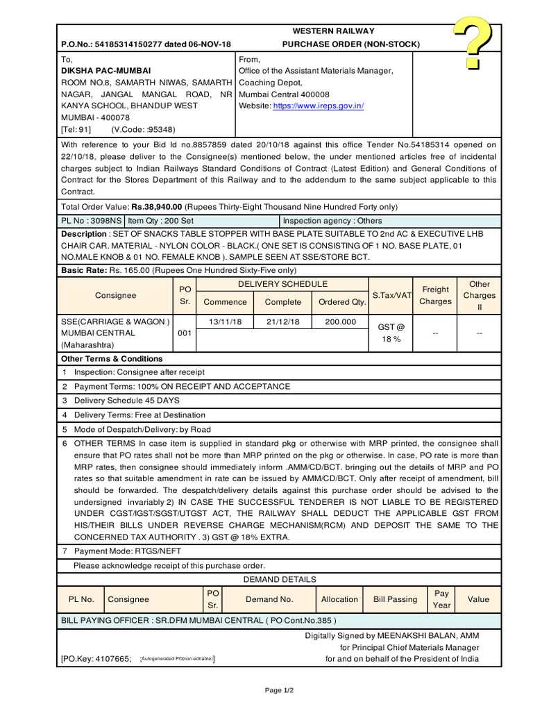 P.O.No.: 54185314150277 dated 06-NOV-18 PURCHASE ORDER (NON-STOCK) MEENAKSHI BALAN