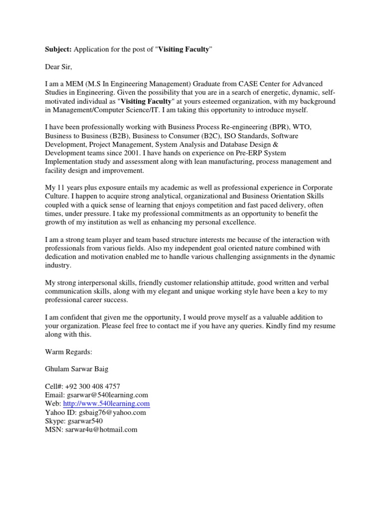 Subject: Application for the post of "Visiting Faculty Dear Sir, I am a MEM (M.