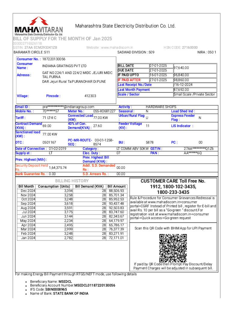 Beneficiary Account Number:MSEDCL01187220130056