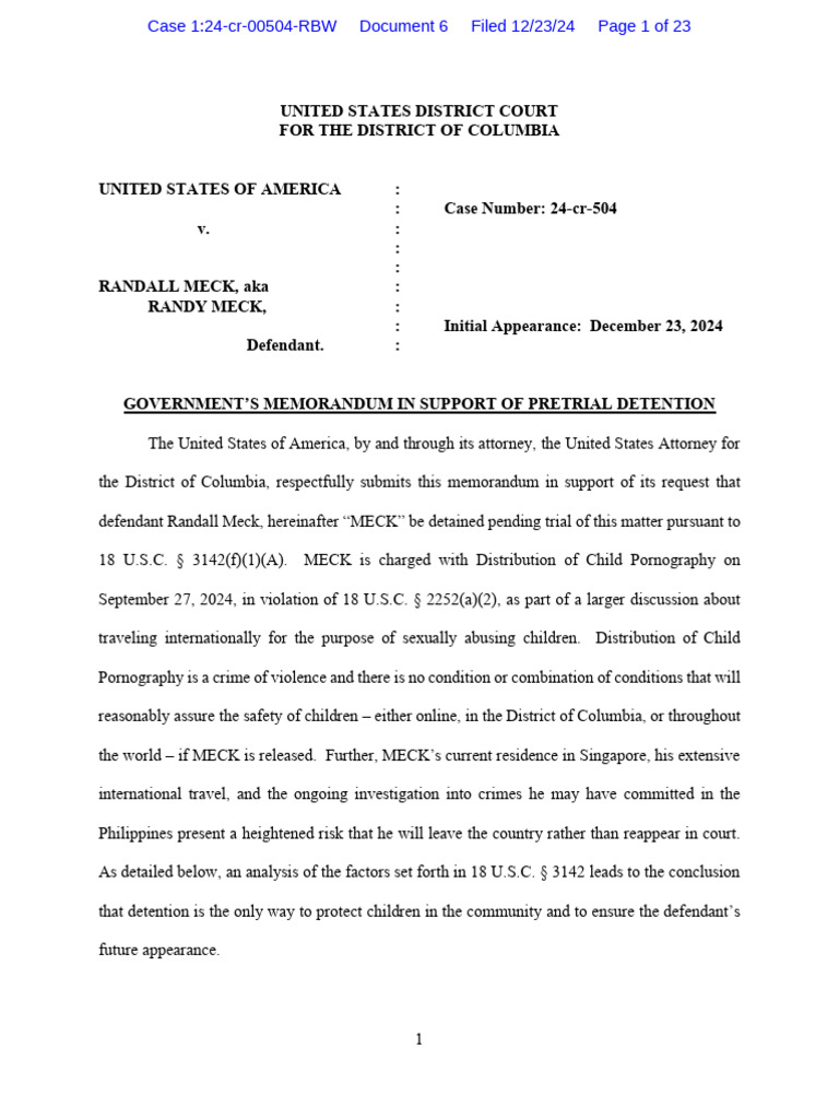 defendant Randall Meck, hereinafter “MECK” be detained pending trial of this matter pursuant to