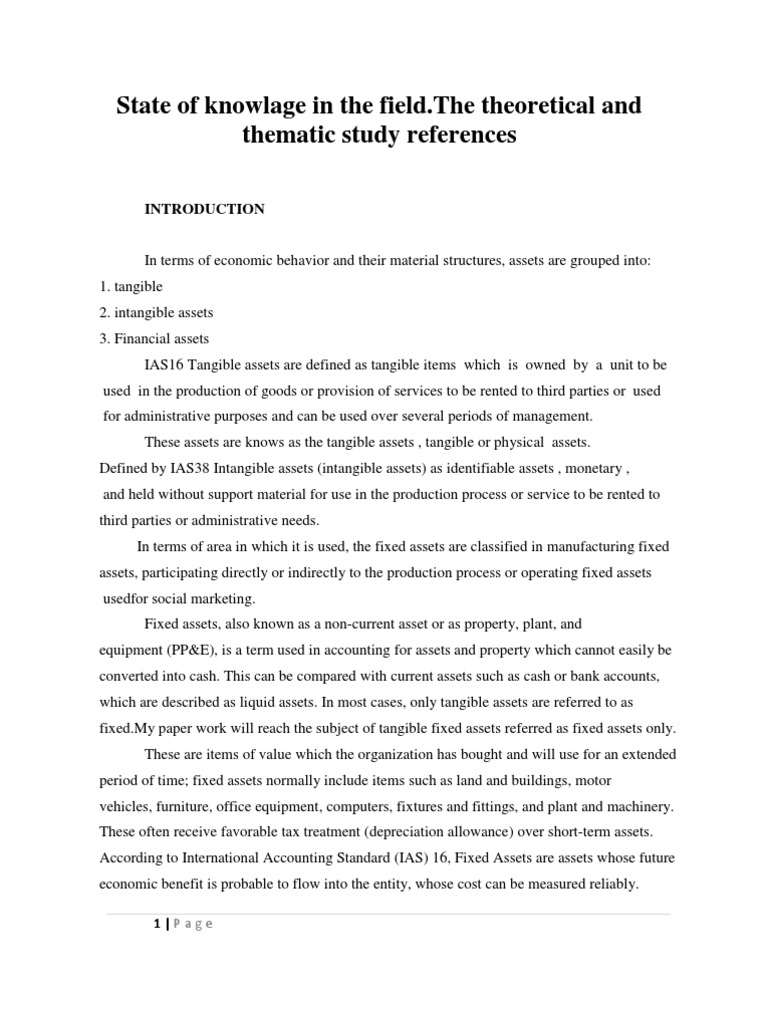 In terms of economic behavior and their material structures, assets are grouped into: 1. tangible 2. intangible assets 3. Financial assets IAS16 Tangible assets are defined as tangible items which is owned by a unit to be used in the production of goods or provision of services to be rented to third parties or used for administrative purposes and can be used over several periods of management. These assets are knows as the tangible assets , tangible or physical assets. Defined by IAS38 Intangible assets (intangible assets) as identifiable assets , monetary , and held without support material for use in the production process or service to be rented to third parties or administrative needs. In terms of area in which it is used, the fixed assets are classified in manufacturing fixed assets, participating directly or indirectly to the production process or operating fixed assets usedfor social marketing. Fixed assets, also known as a non-current asset or as property, plant, and equipment (PP&E), is a term used in accounting for assets and property which cannot easily be converted into cash. This can be compared with current assets such as cash or bank accounts, which are described as liquid assets. In most cases, only tangible assets are referred to as fixed.My paper work will reach the subject of tangible fixed assets referred as fixed assets only. These are items of value which the organization has bought and will use for an extended period of time; fixed assets normally include items such as land and buildings, motor vehicles, furniture, office equipment, computers, fixtures and fittings, and plant and machinery. These often receive favorable tax treatment (depreciation allowance) over short-term assets. According to International Accounting Standard (IAS) 16, Fixed Assets are assets whose future economic benefit is probable to flow into the entity, whose cost can be measured reliably.