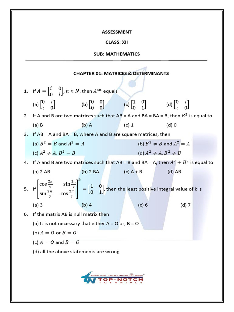 Mathematics XII (Assignment - Matrices & Determinant) ...