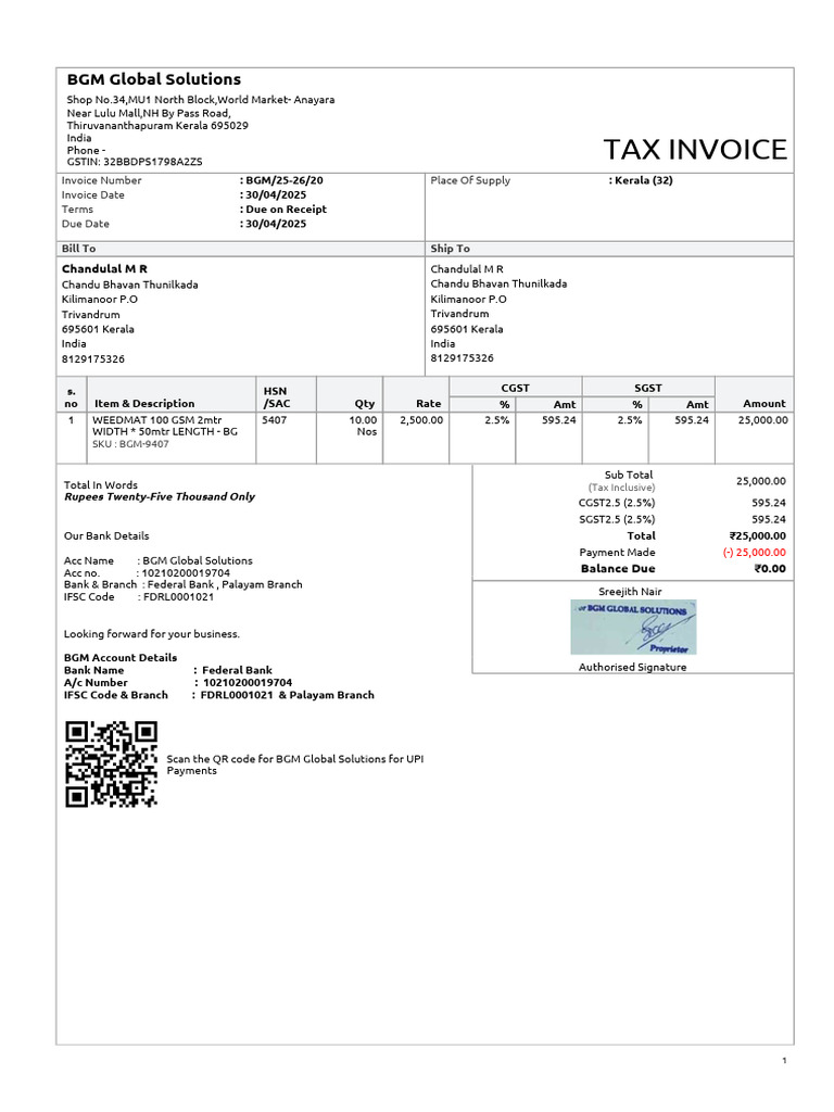 Invoice Number : BGM/25-26/20 Place Of Supply : Kerala (32)