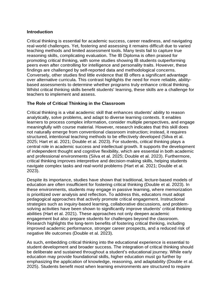 2025; Hart et al. 2021; Double et al. 2023). For students, critical thinking plays a