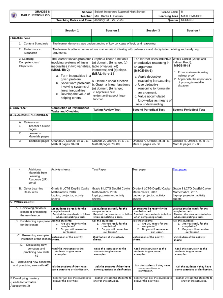 DAILY LESSON LOG Teacher Mrs. Dahlia L. Contaoi Learning Area MATHEMATICS