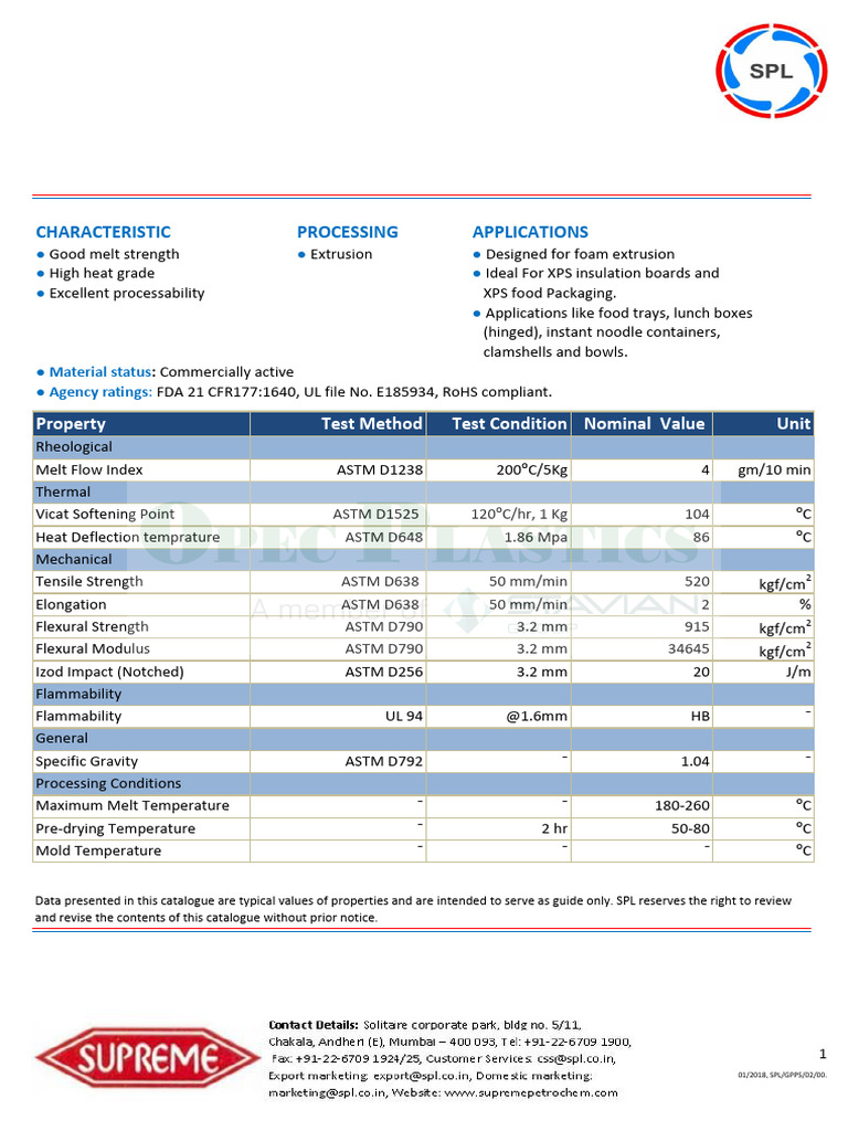 Data presented in this catalogue are typical values of properties and are intended to serve as guide only. SPL reserves the right to review