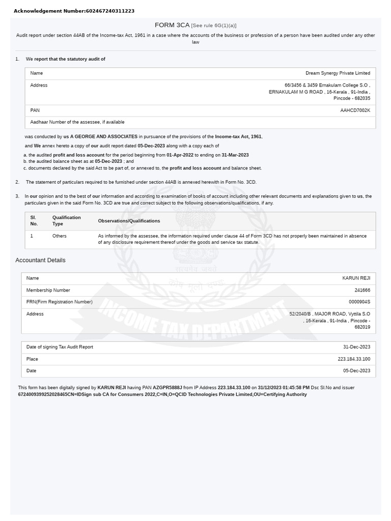 This form has been digitally signed by KARUN REJI having PAN AZGPR5888J from IP Address 223.184.33.100 on 31/12/2023 01:45:58 PM Dsc Sl.No and issuer
