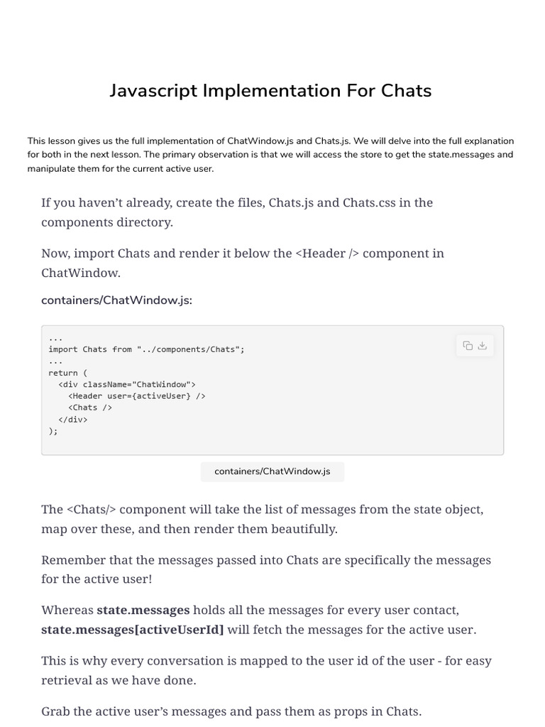 This lesson gives us the full implementation of ChatWindow.js and Chats.js. We will delve into the full explanation