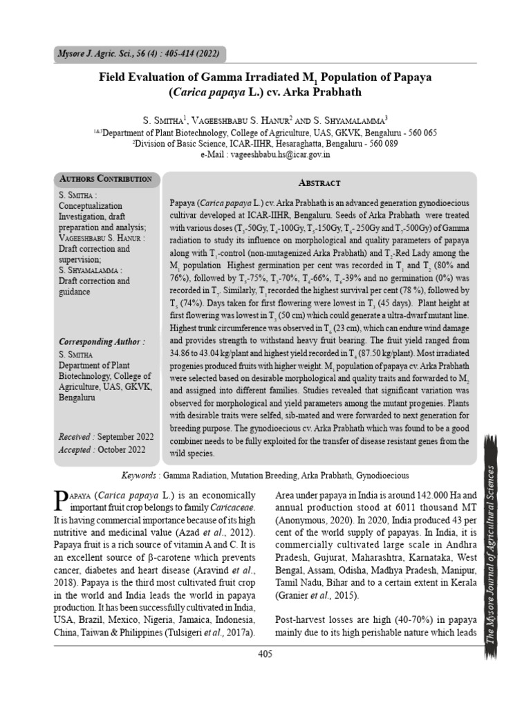 Field Evaluation of Gamma Irradiated M Population of Papaya (L.) Cv. Arka Prabhath