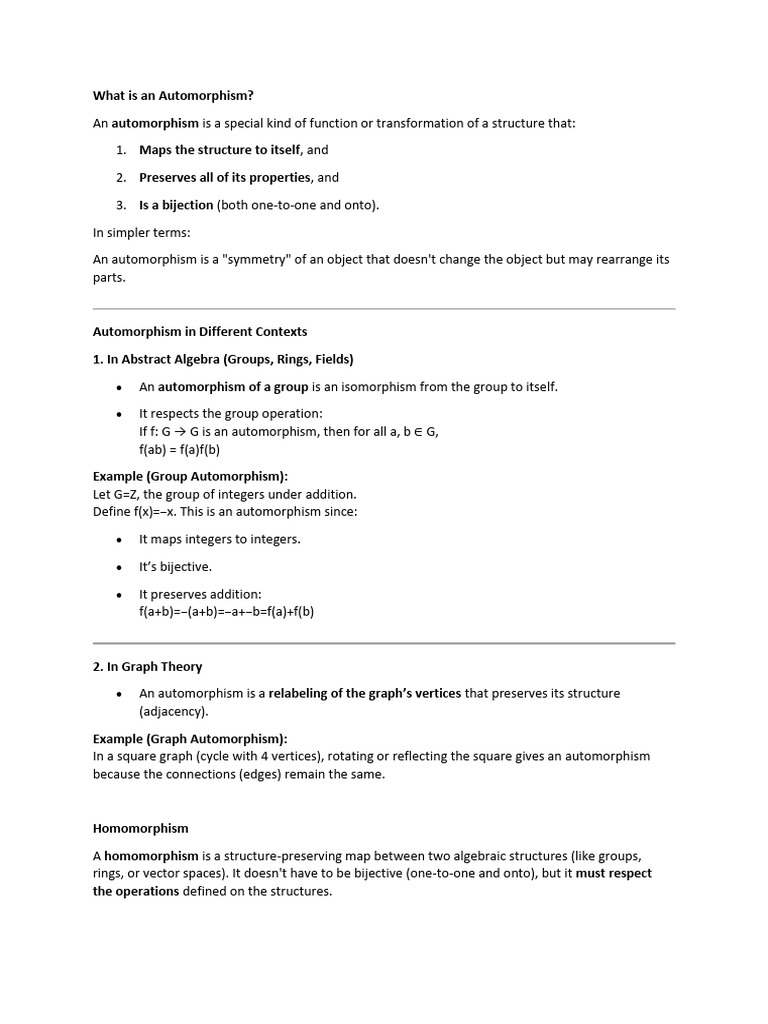 An automorphism is a special kind of function or transformation of a structure that: