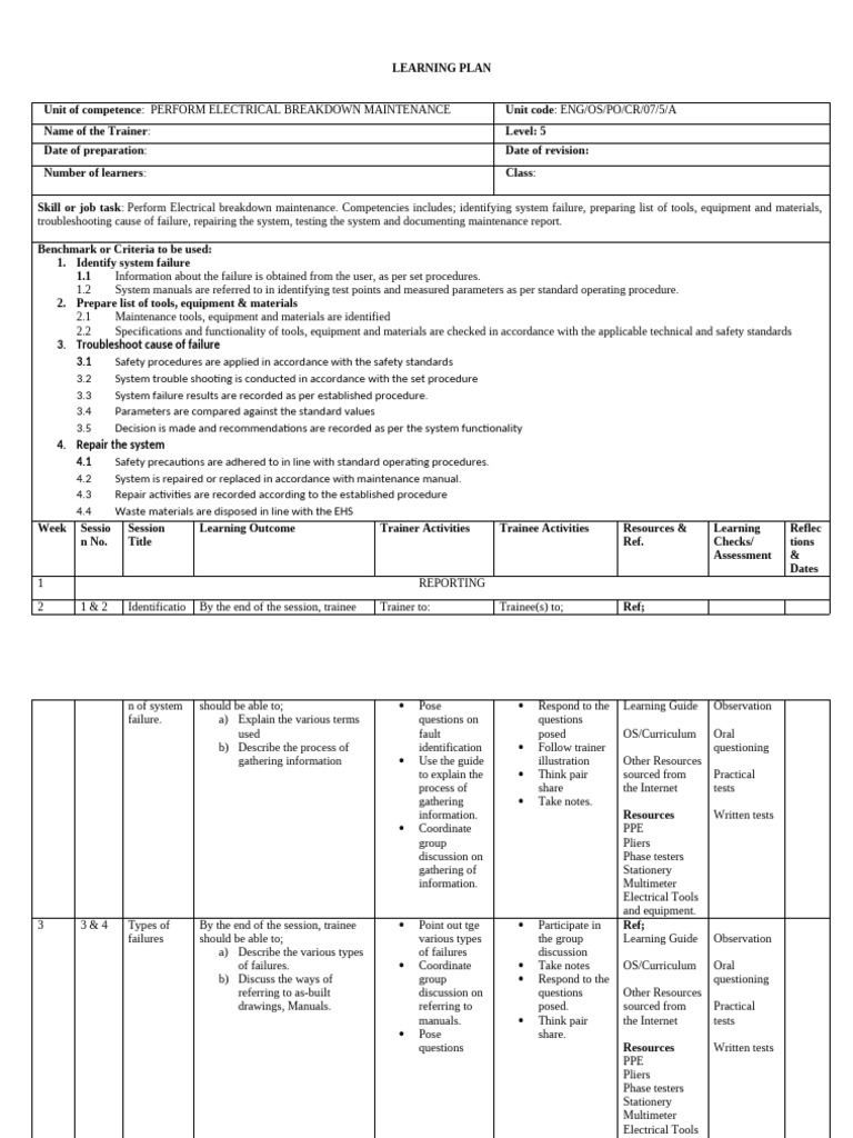 Skill or job task: Perform Electrical breakdown maintenance. Competencies includes; identifying system failure, preparing list of tools, equipment and materials,